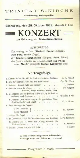 Titel: Trinitatis - Kirche, Berlin - Charlottenburg. Programmzettel zu dem Konzert zur Erhaltung der Diakonissen - Station am 28. Oktober 1922 mit dem Trinitatis - Kinderchor, dem Streichorchester der 'Gesellschaft zur Pflege alter Musik' unter dem Dirigenten Gustav Lenzewski sen., den Solisten Elisabeth Brandt / Sopran und dem Organisten Ferd. Billeb. Auf dem Programm: Werke von Händel, Chr. W. Gluck, L. Steinert, Fr. Wagner, Friedrich der Grosse, Fr. Schubert, A. Guilmant, G. Ph. Teleman, K. Reinecke und R. Succo