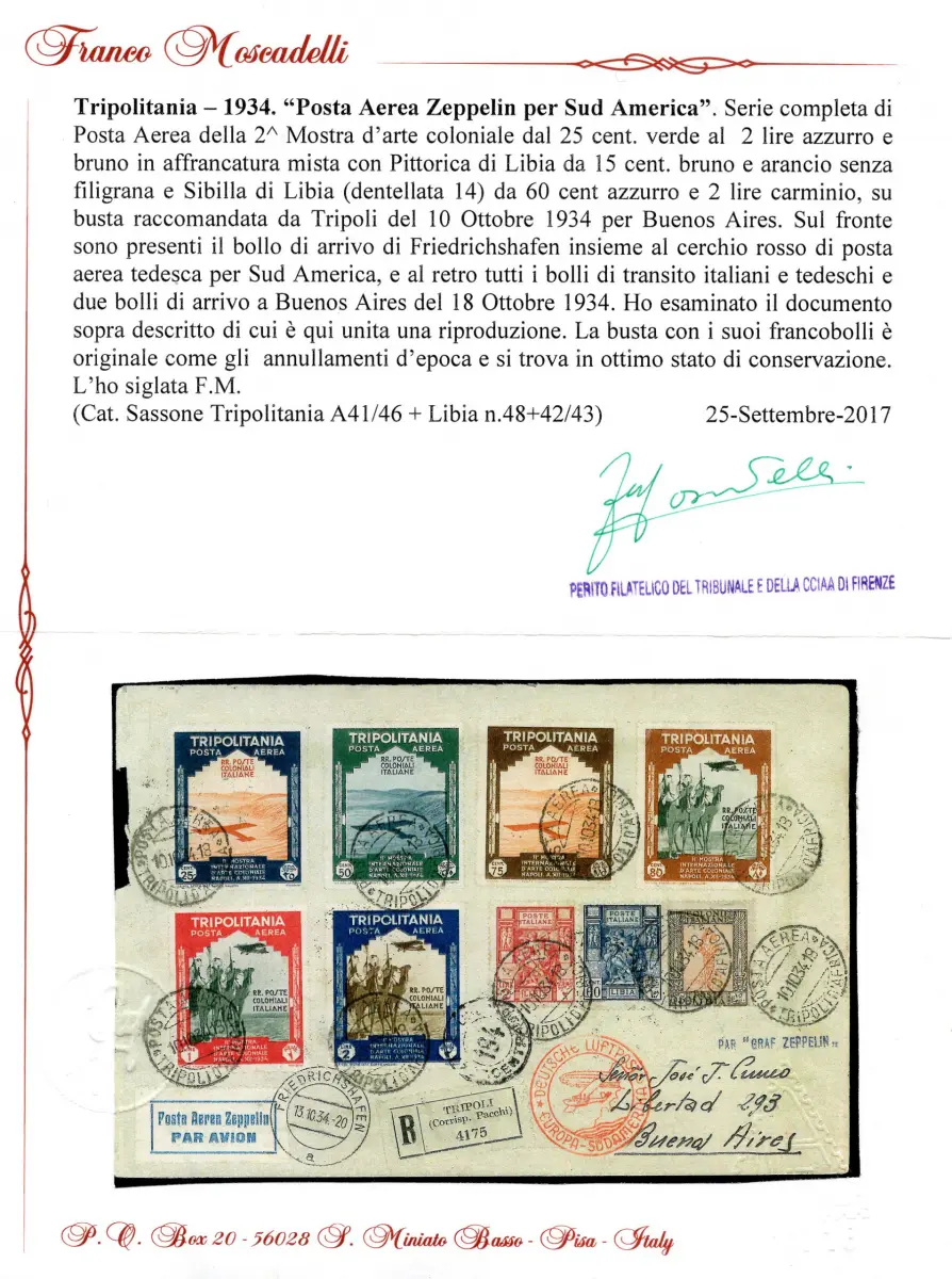 BÜSTE - Tripolitanien - Luftpost Kolonialkunst Nr. 41/46 + Ergänzungen aus Libyen auf Umschlag Racc. auf dem Luftweg Graf Zeppelin am 10.10.34 - neben der Ann. Deutsche Luftpost Europa - Südamerika mit Ann. Transit, Ankunft und Zensur - Sehr schön und ungewöhnlich Cod.1093/182