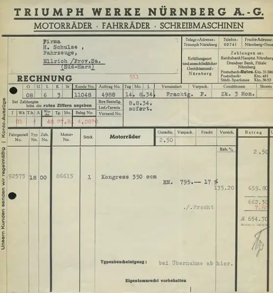 Triumph Werke, Nürnberg Motorrad Kongress 350 Rechnung 1934
