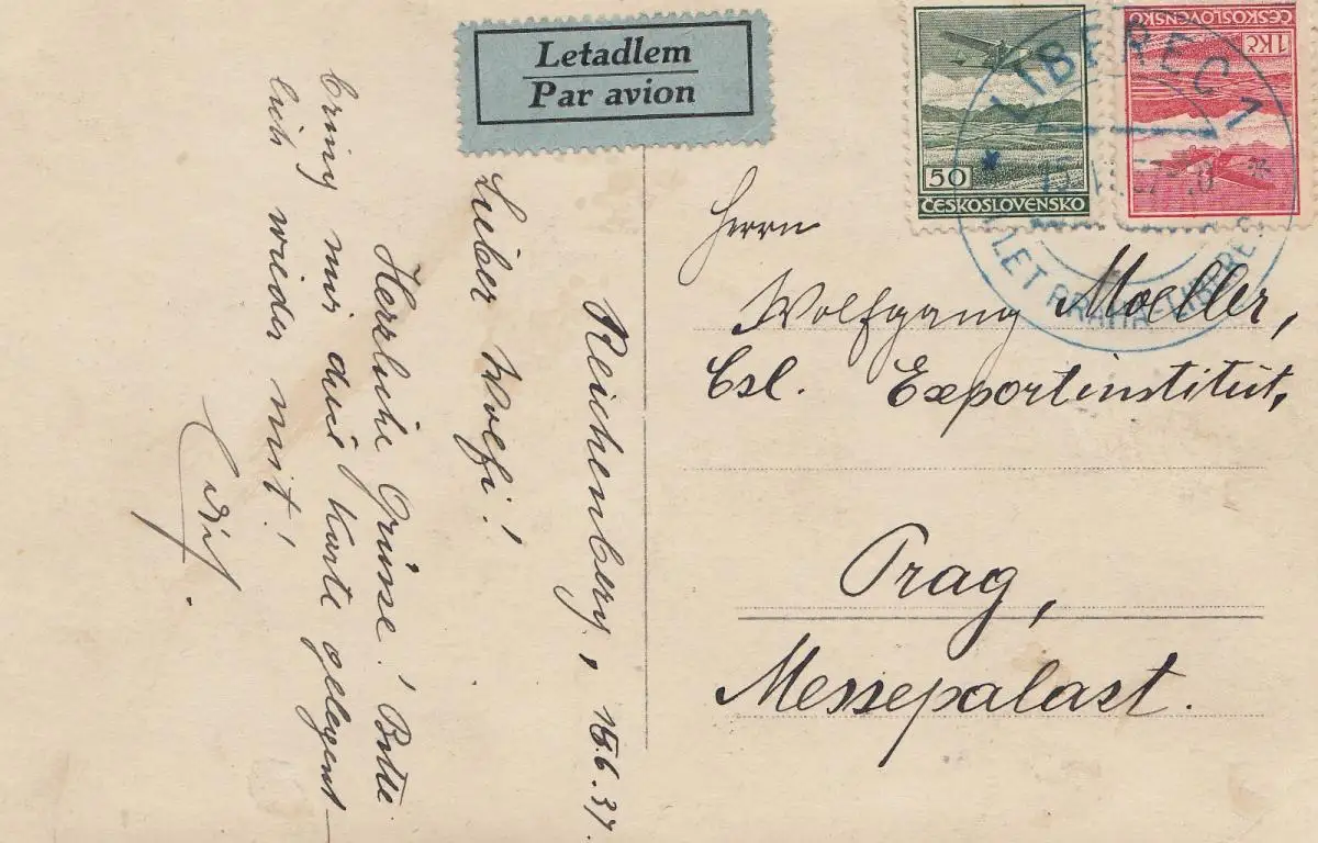 Tschecheslowakei: 1937: Ansichtskarte Reichenberg nach Prag, Ersttag