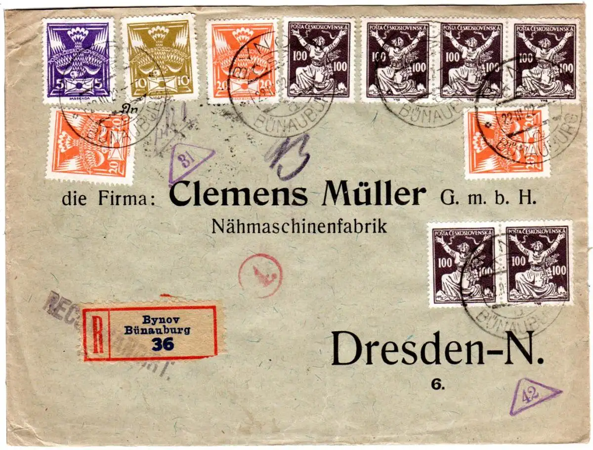 Tschechoslowakei 1922, 11 Marken auf Einschreiben Zensur Brief v. Bünauburg