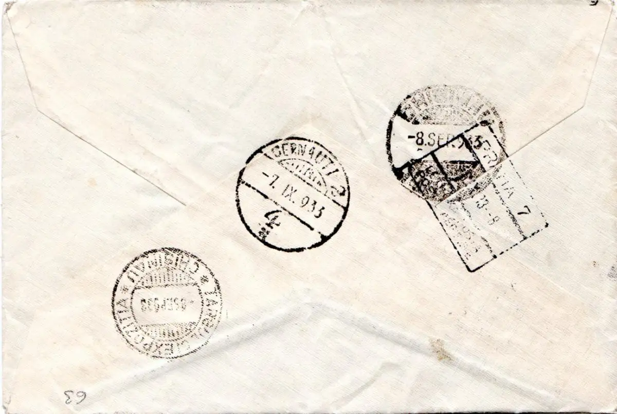 Luftpostbrief via Prag n. Chisinau. Diverse Stempel rückseitig.