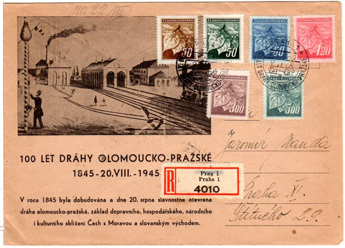 Tschechoslowakei 1945, 6 Marken auf Eisenbahn Jubiläum Reko-Brief v. Prag