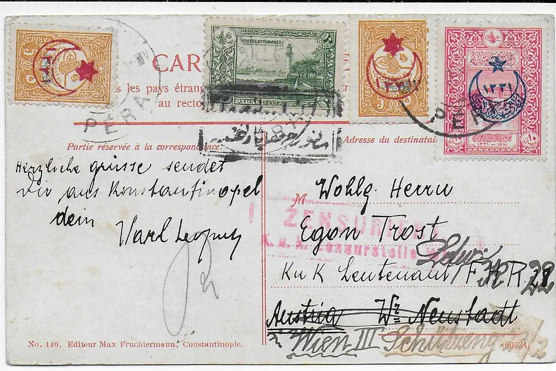 Türkei: AK Constantinople um 1915 an KuK Leutnant Neustadt, Zensur