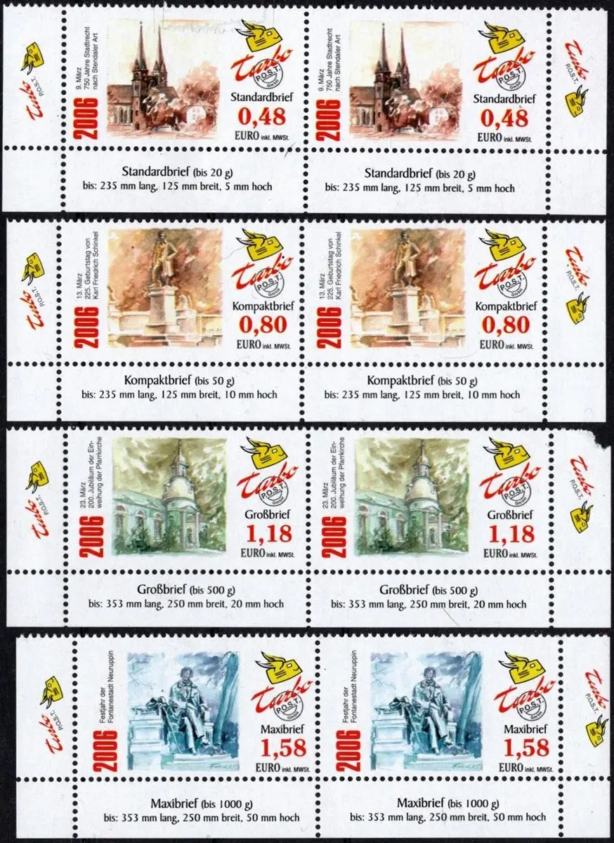 • MichSeite Turbopost: MiNr. 7 - 10, 03.06.2006, "750 Jahre Neuruppin", Satz, Eckrand, postfrisch Beschreibung \nAusgabeland: Bundesrepublik Deutschland \nPostdienstleister: Turbopost, Neuruppin \nAusgabeanlass: Briefmarkenausgabe "750 Jahre Neuruppin: Stadtrecht, Karl Friedrich Schinkel, Pfarrkirche Neuruppin, Fontanestadt Neuruppin" Katalognummer: MiNr.  7 - 10 Ausgabedatum: 03.06.2006 Nominale: Satz (4 Werte) zu 0,48 EUR, 0,80 EUR, 1,18 EUR, 1,58 EUR \nTyp: - \nErhaltung: nassklebend, gezähnt, postfrisch \nHinweis: Unterrandpaare mit Erklärungen zu den jeweiligen Ausgaben und zur Portostufe Thema: Fontane, Kirche