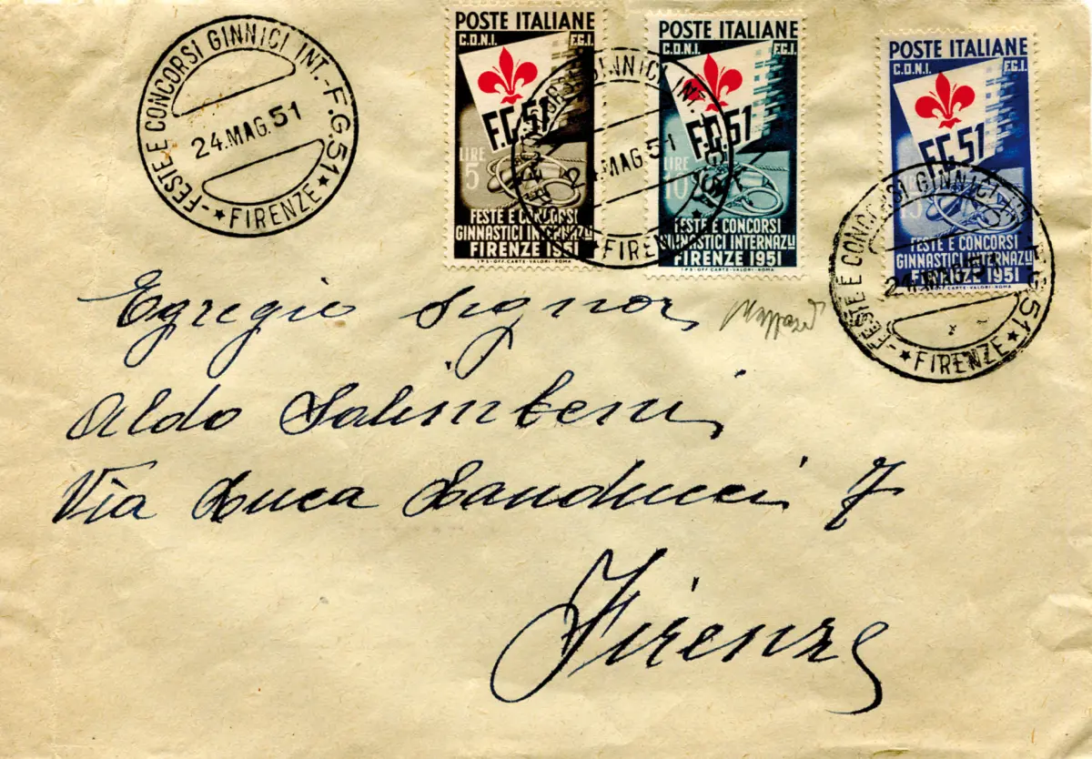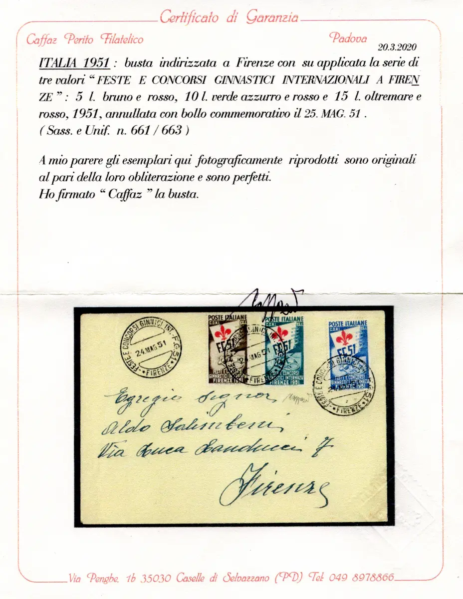 Turnschuhe komplette Serie auf annulliertem Umschlag mit Gedenkstempel BÜSTE - Gymnastiker Nr. 661/663 komplette Serie auf gestempeltem Umschlag mit Gedenkstempel vom 24.5.51 - nicht gereist - Sammlergebraucht original - Zert. Caffaz - Kat. euro 2.500 Cod. 262/16