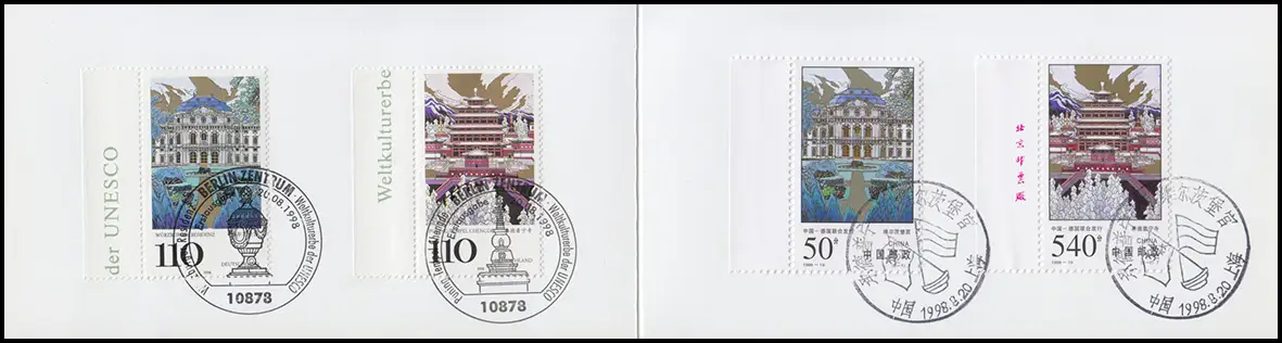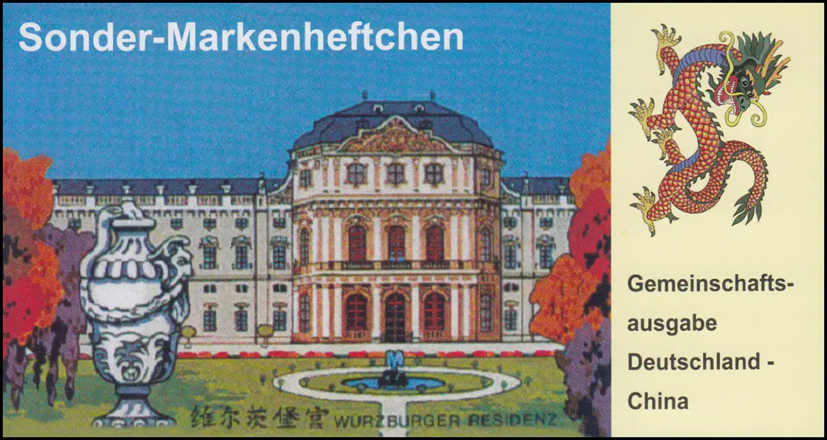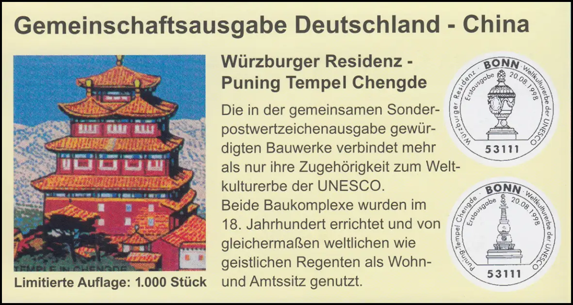 privates Markenheftchen mit beiden Briefmarken-Ausgaben Deutschland 2007-2008 und China 2934-2935 (insgesamt vier Marken) der Würzburger Residenz und vom Puning Tempel in Chengde. Das Heftchen wurde wie angegeben in einer limitierten Auflage von 1000 Stück hergestellt. Die Marken zeigen den jeweils passenden Ersttags-Sonderstempel vom 20.8.1998.