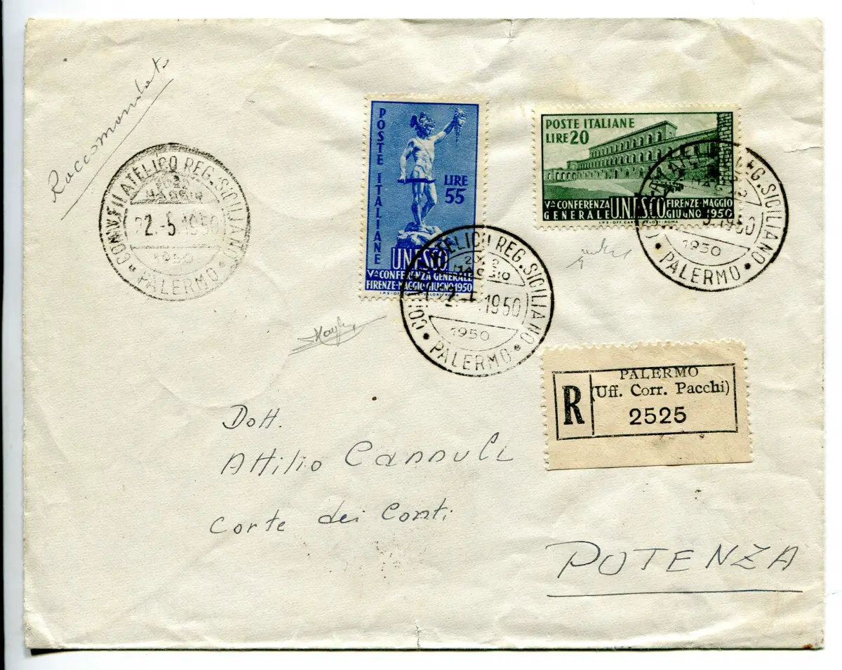 UNESCO-Serie auf Umschlag Racc. von Palermo nach Potenza Umschlag - UNESCO Nr. 618/619 Serie auf Umschlag Racc. von Palermo nach Potenza am 22.5.50 (I. Ausgabetag) - CH Cod. 267/13