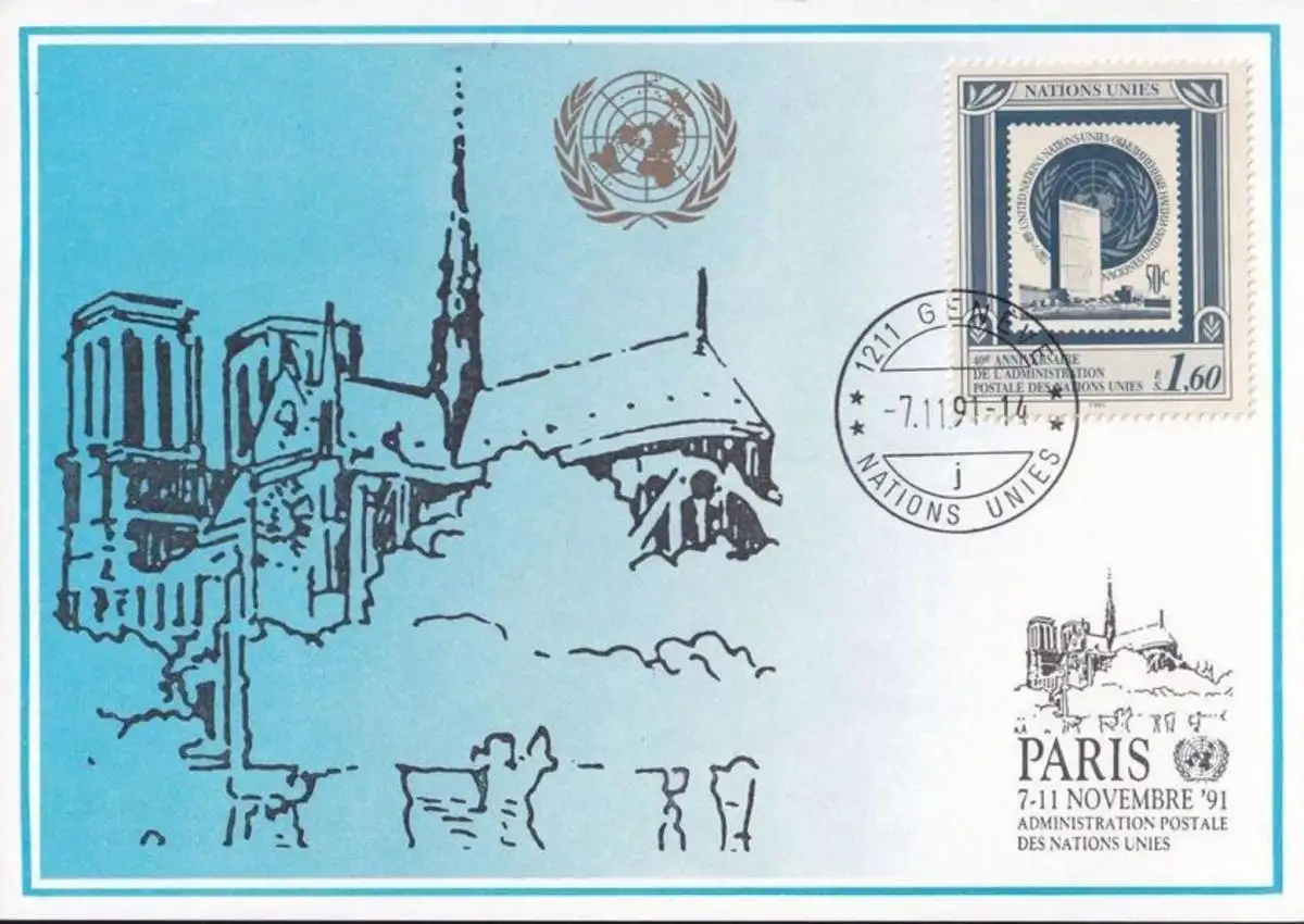 UNO GENF 1991 Mi-Nr. 223 Blaue Karte - blue card mit Erinnerungsstempel PARIS