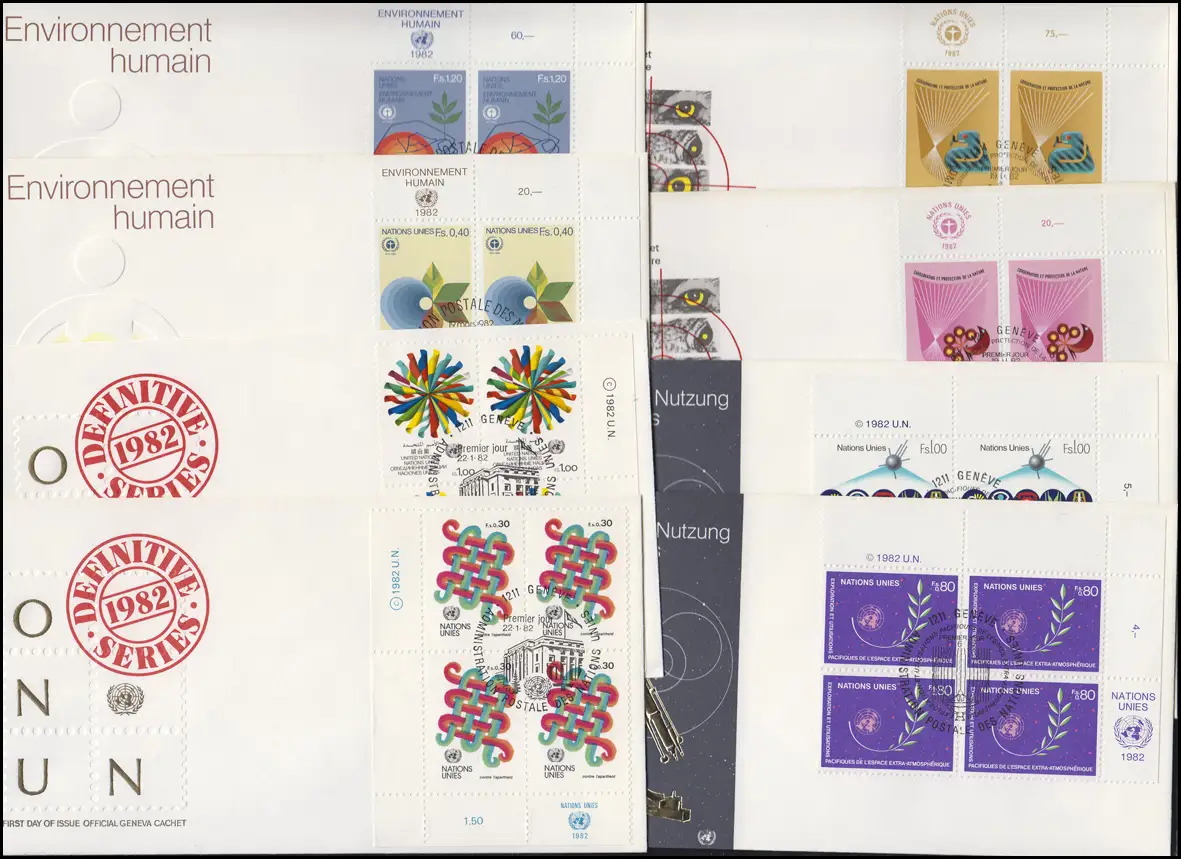 UNO Genf 103-110 Jahrgang 1982, ER-Viererblöcke mit TAB, 8 Schmuck-FDC GENF