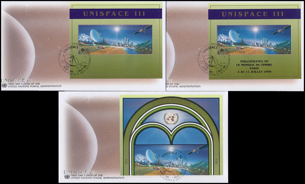 UNO Genf: Weltraum UNISPACE Block 11, Block 11I und OR-Paar je auf Schmuck-FDC