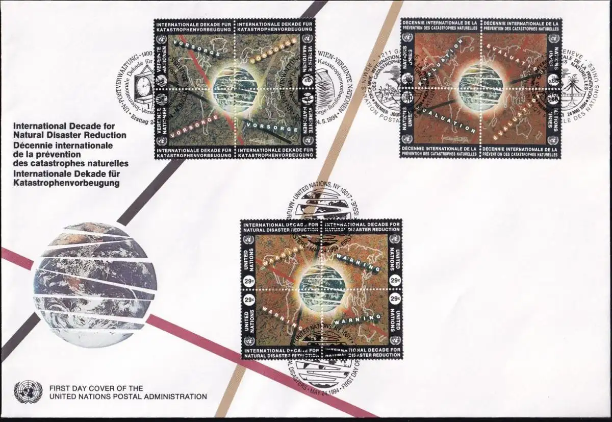 UNO NEW YORK - WIEN - GENF 1994 TRIO-FDC Katastrophenvorbeugung