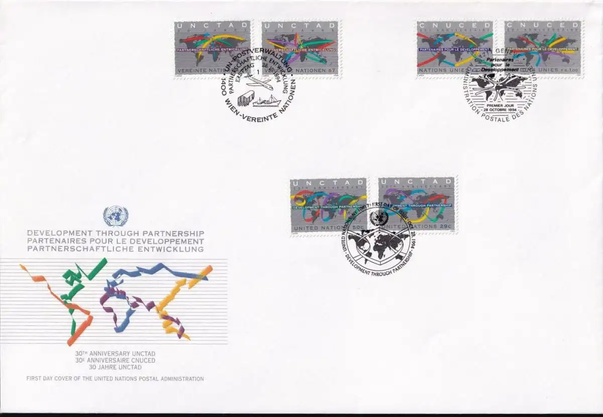 UNO NEW YORK - WIEN - GENF 1994 TRIO-FDC Partnerschaftliche Entwicklung