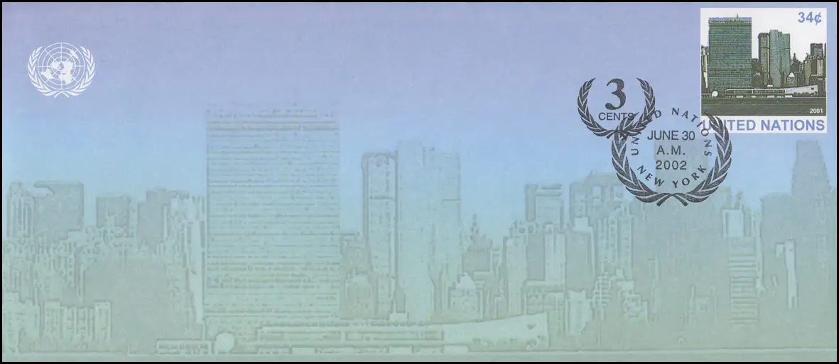 UNO New York Umschlag U 14B Hauptquartier 34+3 C. 2002, 242x105, FDC 30.6.2002