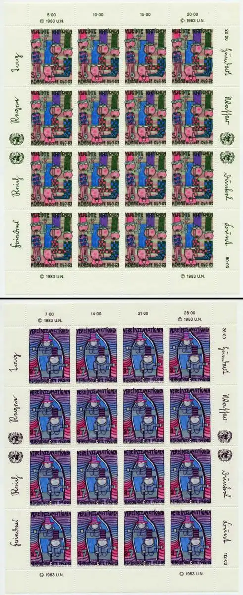 35. Jahrestag der allgemeinen Erklärung der Menschenrechte / Friedensreich Hundertwasser, / 2 Kleinbogen