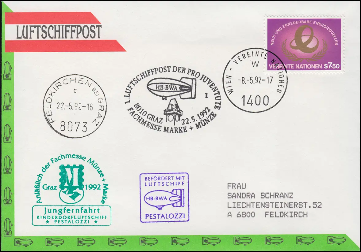 Luftschiffspostbeleg 14. DKL mit Bordstempel HB-BWA PESTALOZZI und grüner Nebenstempel "Jungfernfahrt anläßlich der Fachmesse Münze+Marke Graz 1992".