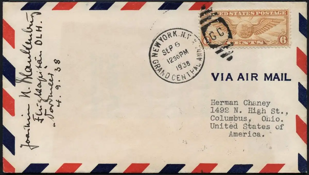Flugpostbrief aus New York nach Columbus/Ohio mit der datierten Unterschrift des deutschen Katapultflugzeugpiloten Joachim Blankenburg (Nordmeer DLH).