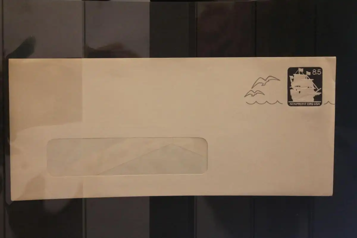U.S.A. 1986; Ganzsache Nonprofit Org.; 8,5 C.; Langformat; mit Fenster, Segelschiff; ungebraucht