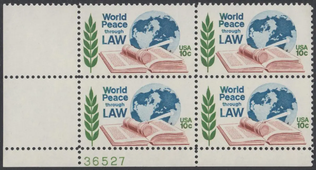 USA Michel 1186 / Scott 1576 postfrisch PLATEBLOCK ECKRAND unten links m/ Platten-# 36527 - Juristenkongress in Washington, DC; Gesetzbuch und Hammer vor Erdkugel