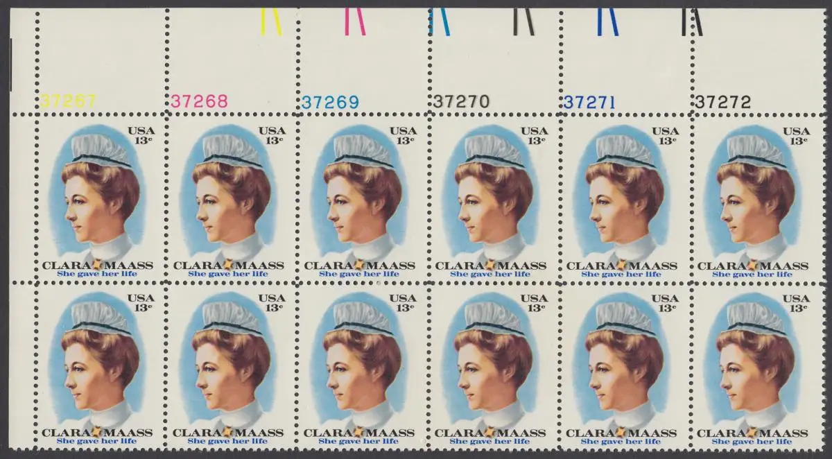 USA Michel 1286 / Scott 1699 postfrisch horiz.PLATEBLOCK(12) ECKRAND oben links m/ Platten-# 37267 - Clara Maass, Krankenschwester