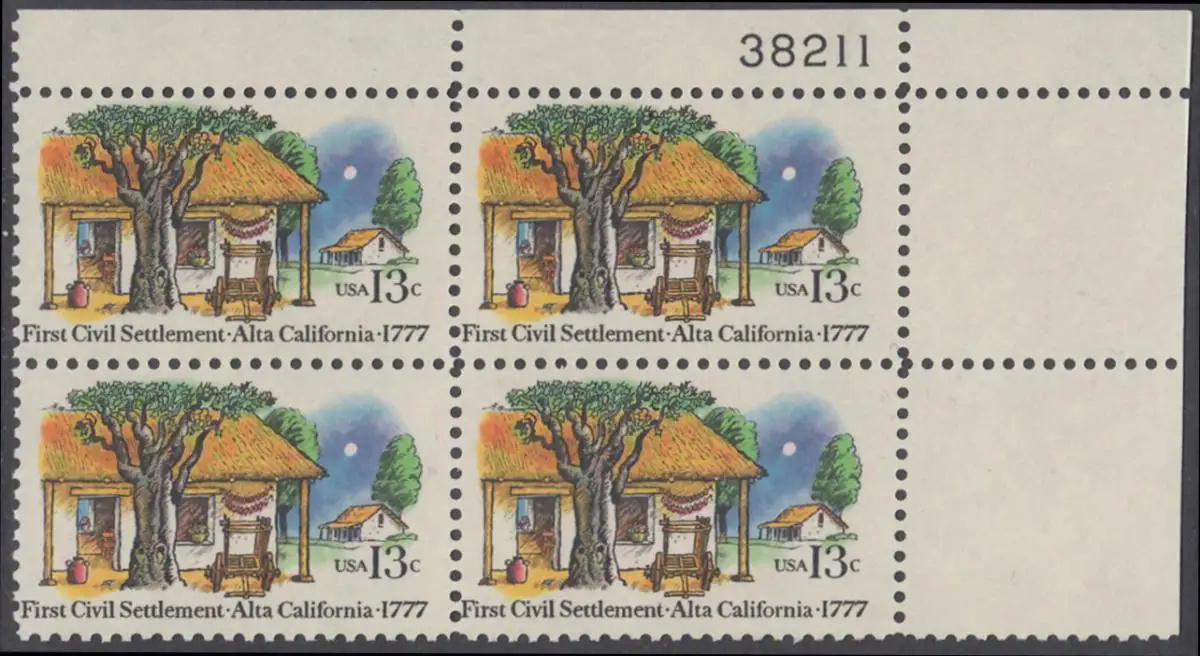 USA Michel 1311 / Scott 1725 postfrisch PLATEBLOCK ECKRAND oben rechts m/ Platten-# 38211 - 200. Jahrestag der ersten zivilen Niederlassung in Kalifornien; Farmhäuser in Alta California