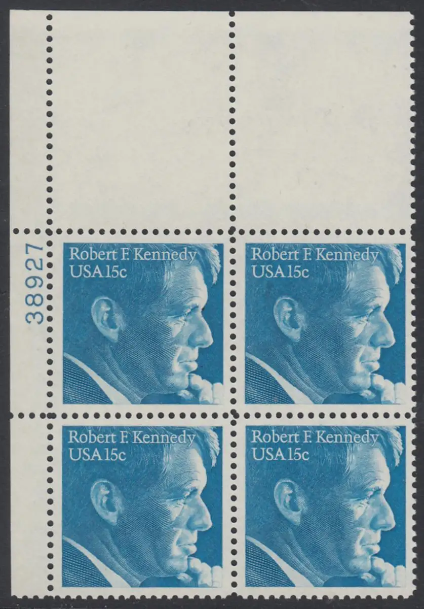 USA Michel 1371 / Scott 1770 PLATEBLOCK ECKRAND oben links m/ Platten-# 38927 - Robert Francis Kennedy, Politiker