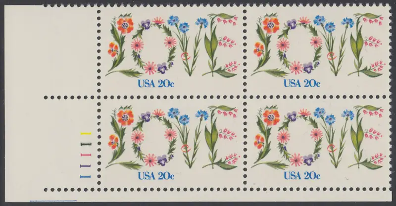 USA Michel 1528 / Scott 1951 postfrisch PLATEBLOCK ECKRAND unten links m/ Platten-# 11111 (a) - Valentinstag: Blumen bilden das Wort LOVE