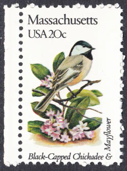USA Michel 1552 / Scott 1973 postfrisch EINZELMARKE RAND links (a1) - Vögel und Blumen der 50 Bundesstaaten: Massachusetts: Chickadee-Meise/Maiblumenstrauch