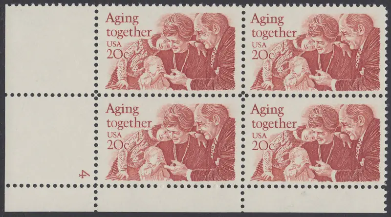 USA Michel 1591 / Scott 2011 postfrisch PLATEBLOCK ECKRAND unten links m/ Platten-# 4 - Gemeinsames Altern: Großeltern und Enkel