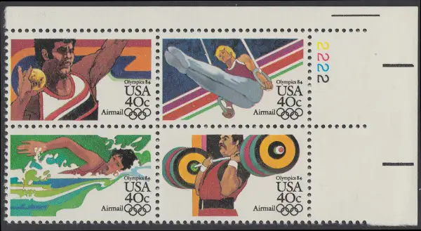 USA Michel 1622-1625 / Scott C105-C108 postfrisch PLATEBLOCK ECKRAND oben rechts m/ Platten-# 2222 (c) - Olympische Sommerspiele 1984, Los Angeles