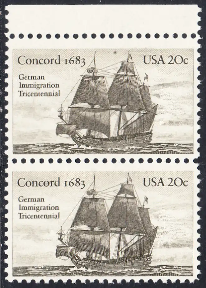 USA Michel 1628 / Scott 2040 postfrisch vert.PAAR RAND oben- Jahrestag der Einwanderung der ersten Deutschen in Amerika: Einwanderer-Segelschiff Concord (1683)