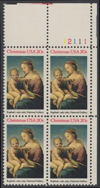 USA Michel 1663 / Scott 2063 postfrisch PLATEBLOCK ECKRAND oben rechts m/ Platten-# 12111 (e) - Weihnachten: HI. Jungfrau und Kind