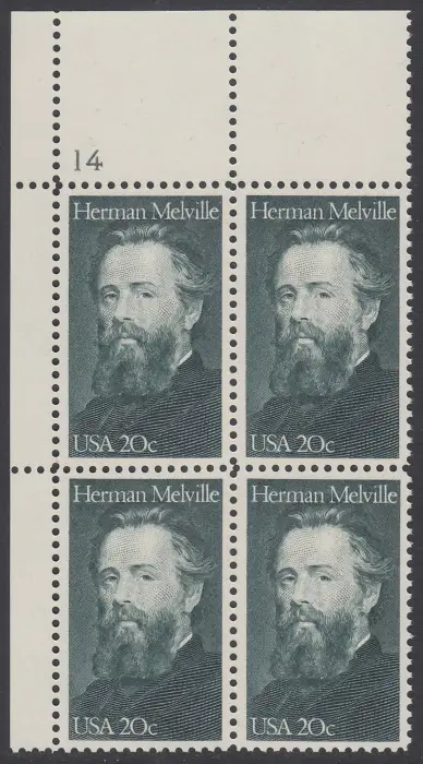 USA Michel 1703 / Scott 2094 postfrisch PLATEBLOCK ECKRAND oben links m/ Platten-# 14 - Herman Melville. Schriftsteller