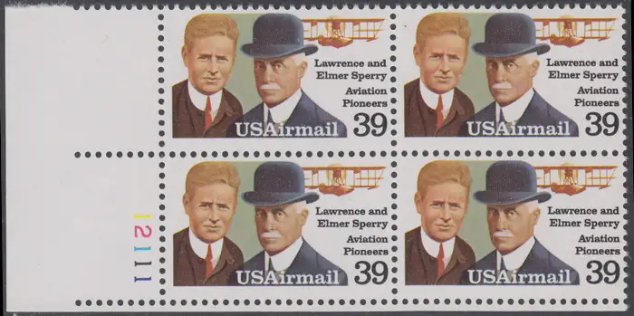 USA Michel 1726 / Scott C114 postfrisch PLATEBLOCK ECKRAND unten links m/ Platten-# 12111 (e) - Luftpost: Flugpioniere - Lawrence (1892-1931) und Elmer Sperry (1860-1930), Flugboot Curtiss F