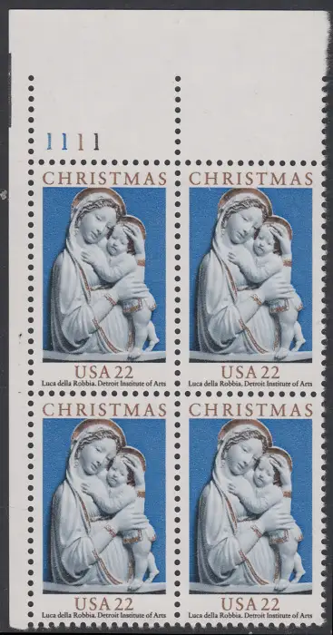 USA Michel 1778 / Scott 2165 postfrisch PLATEBLOCK ECKRAND oben links m/ Platten-# 1111 - Weihnachten: Genua-Madonna