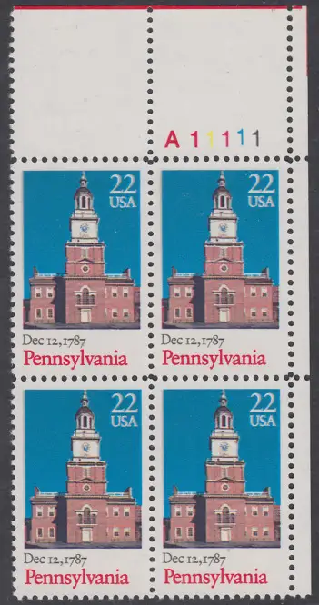 USA Michel 1942 / Scott 2337 postfrisch PLATEBLOCK ECKRAND oben rechts m/ Platten-# A11111 (d) - 200. Jahrestag der Ratifizierung der Verfassung durch den Staat Pennysylvania: Independence Hall, Philadelphia, PA