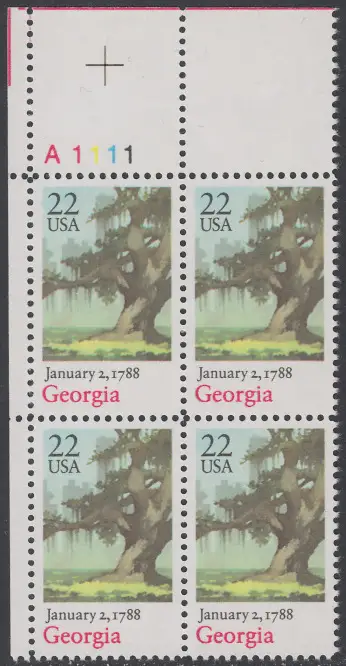 USA Michel 1960 / Scott 2339 postfrisch PLATEBLOCK ECKRAND oben links m/ Platten-# A1111 - 200. Jahrestag der Ratifizierung der Verfassung durch den Staat Georgia: Eiche