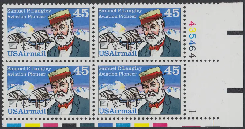 USA Michel 1977 / Scott C118 postfrisch PLATEBLOCK ECKRAND unten rechts m/ Platten-# 1 - Luftpost - Flugpioniere: Samuel P. Langley (1834-1906), Astrophysiker, Flugzeugkonstrukteur; Motorflugzeug Aerodrome No. 5 (1896)