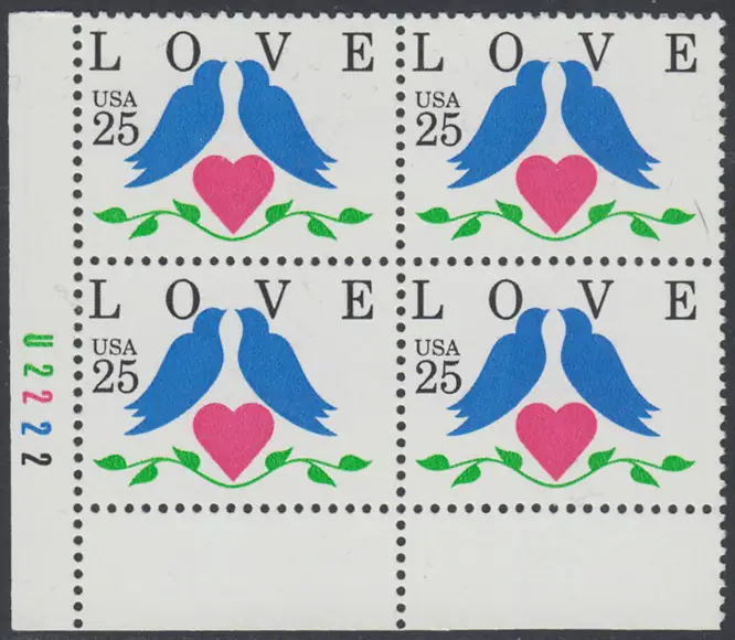 USA Michel 2073 / Scott 2440 postfrisch PLATEBLOCK ECKRAND unten links m/ Platten-# U2222 (c) - Grußmarken: Tauben, Herz