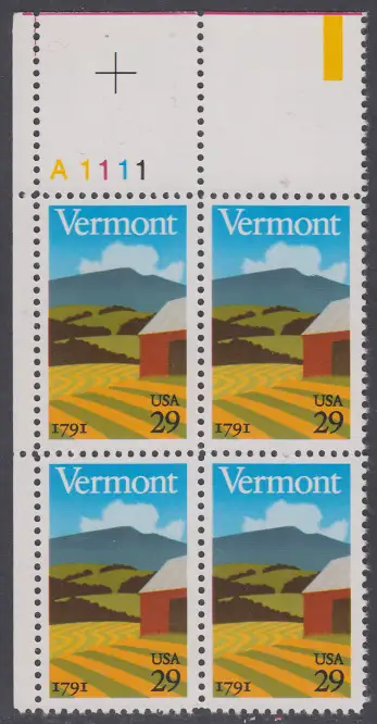 USA Michel 2121 / Scott 2533 postfrisch PLATEBLOCK ECKRAND oben links m/ Platten-# A1111 - 200 Jahre Staat Vermont: Landschaft in Vermont