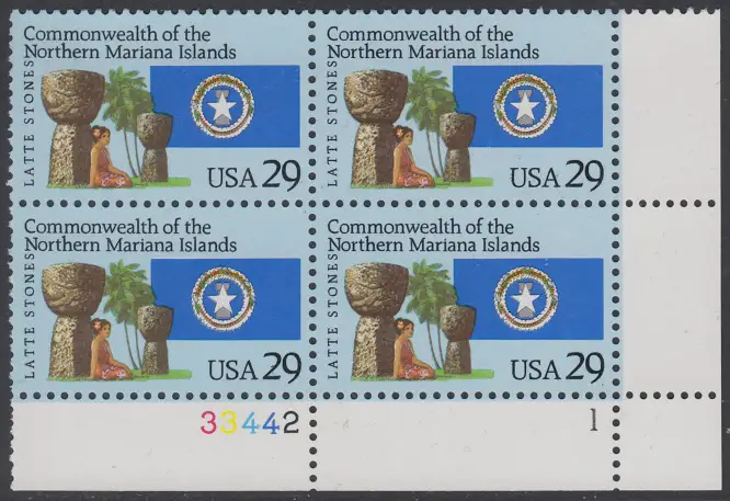 USA Michel 2423 / Scott 2804 postfrisch PLATEBLOCK ECKRAND unten rechts m/ Platten-# 33442-1 - 15 Jahre Commonwealth der Nördlichen Marianen: Latte-Steine