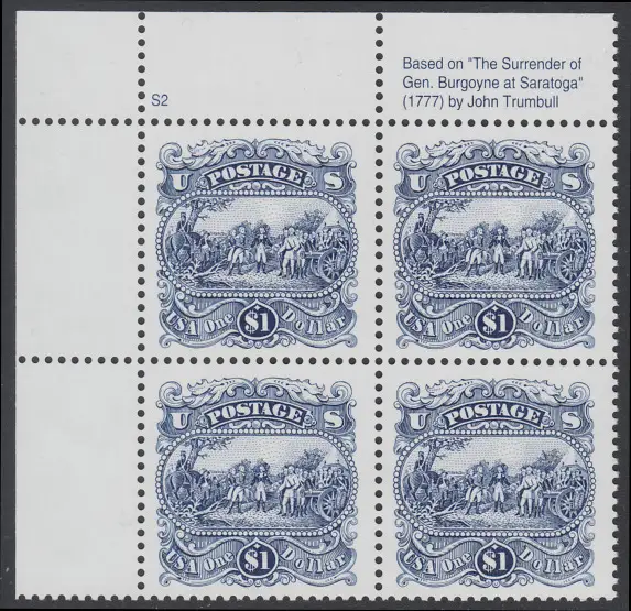 USA Michel 2455 / Scott 2590 postfrisch PLATEBLOCK ECKRAND oben links m/ Platten-# S2 (a) - Die Kapitulation von General Burgoyne bei Saratoga