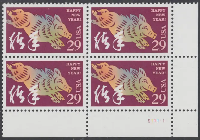 USA Michel 2541 / Scott 2876 postfrisch PLATEBLOCK ECKRAND unten rechts m/ Platten-# S11111 (c) - Chinesisches Neujahr: Jahr des Schweins