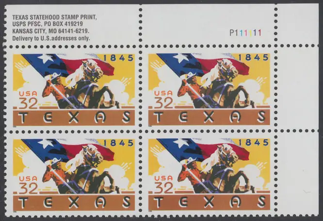 USA Michel 2575 / Scott 2968 postfrisch PLATEBLOCK ECKRAND oben rechts m/ Platten-# P111111 (d) - 150 Jahre Staat Texas: Reiter mit texanischer Fahne