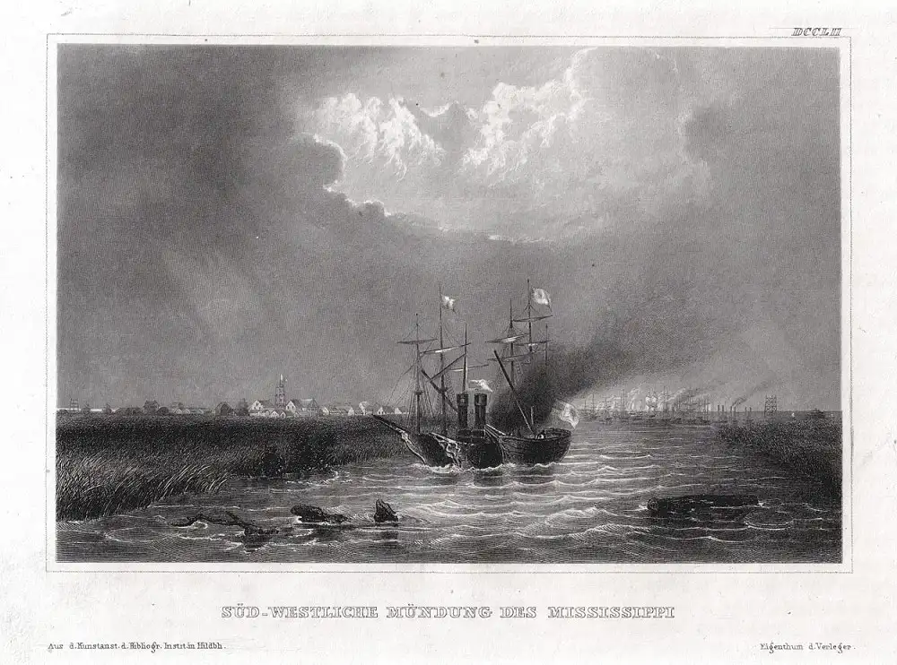 USA Mündung des Mississipi. Echter Stahlstich um 1850
