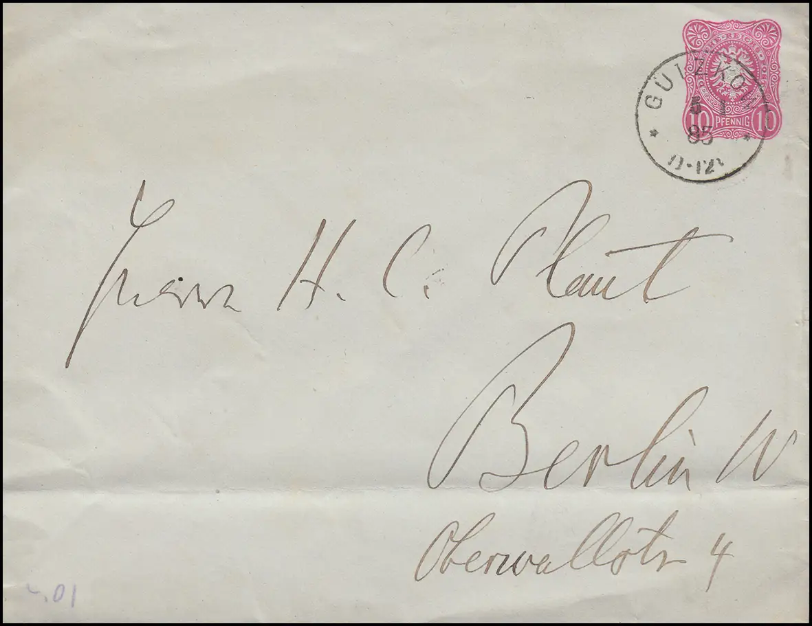 Umschlag U 12B Adler 10 Pfennig Format 146,5x113,5 GÜLZKOW 5.1.1885 nach Berlin