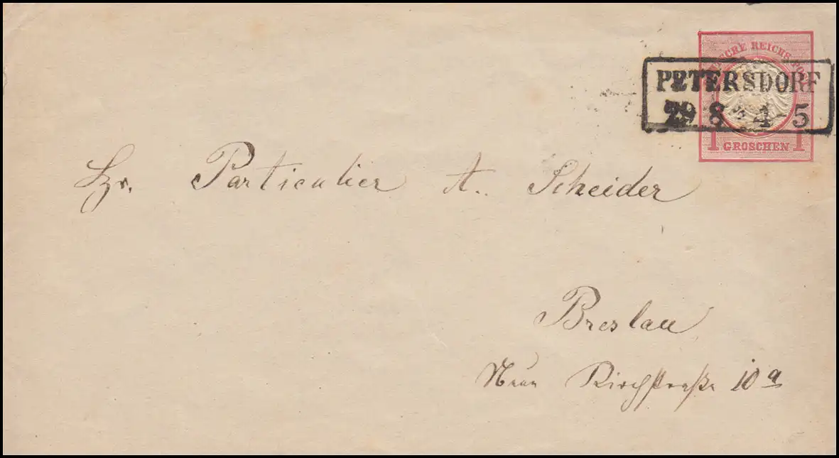 Umschlag U 5 AII Brustschild Rahmenstempel PETERSDORF 29.8.1873 nach BRESLAU