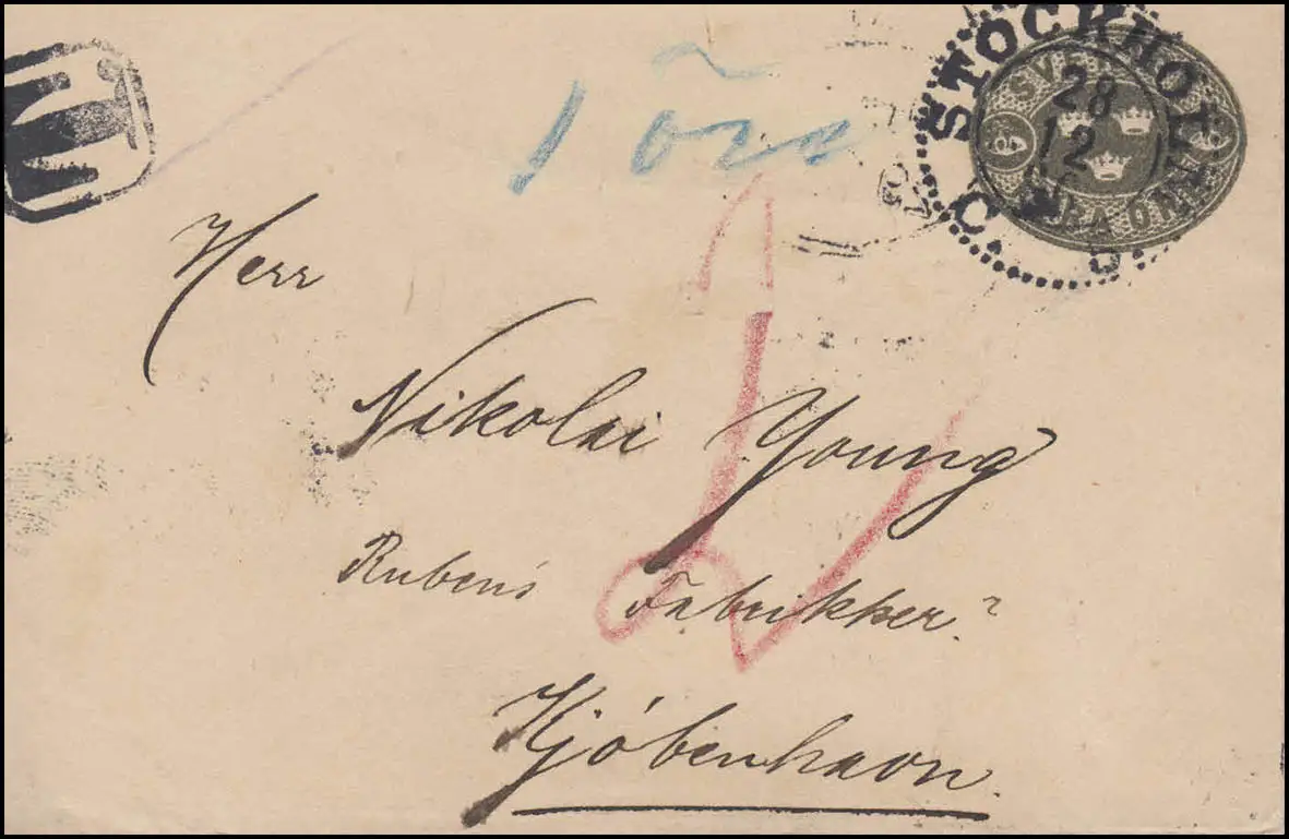 mit Taxe-Stempel nach Dänemark, Ankunftsstempel KOPENHAVN