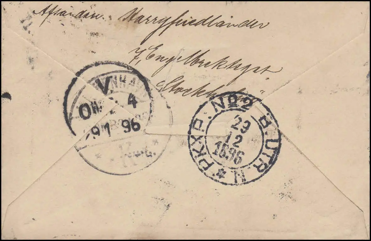 Umschlag U 8 Drei Kronen 4 Öre, STOCKHOLM 28.12.96 per Bahnpost PKXP 29.12.96