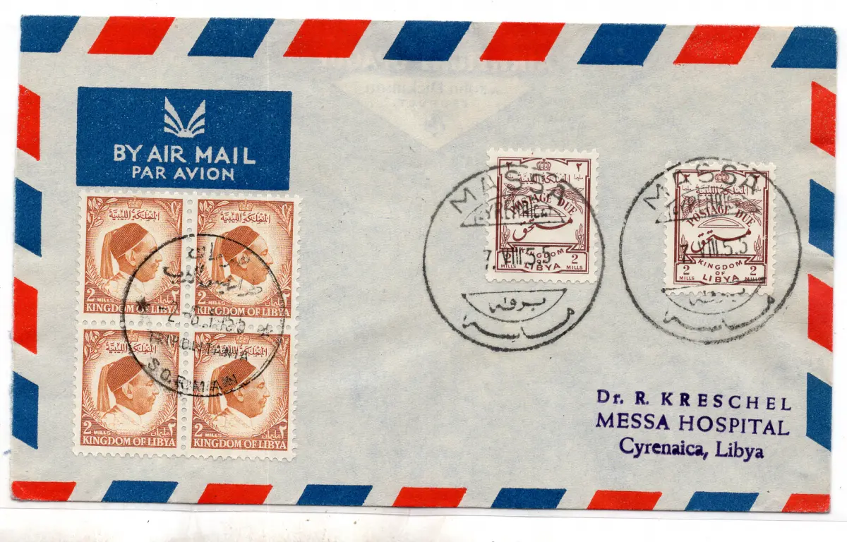 Umschlag - - - Unabhängiges Libyen - König Idris 2 m. Ocker Nr. 34 Viertel auf Umschlag von Sorman Tripolitanien am 2.8.55 für Steuermasse bei Ankunft am 7.8.55 mit Steuermarkenpaar 2 m. Braun Nr. 1 - Rückseite Ann. von Bengasi und Massa - Ungewöhnlich, obwohl als philatelistische Verwendung Cod. 2550 / WEB